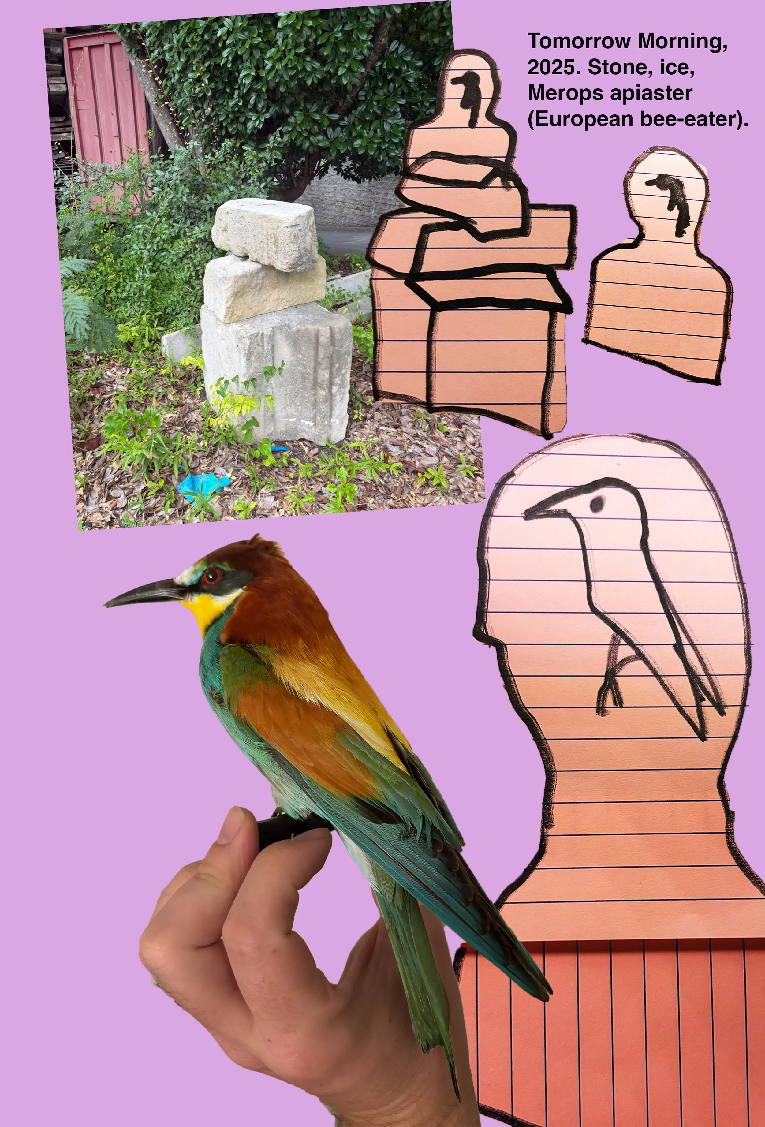 Scott Keightley will compose a sculpture made of limestone, ice, and a taxidermied bird (European bee-eater/Merops apiaster.) The bird will be frozen in a block of ice, which will then be carved to roughly the dimensions of the head and shoulders of a person. This will be situated on a stack of three limestone blocks. These three elements -the bird, the ice, and the limestone, will combine to form a temporary statue.